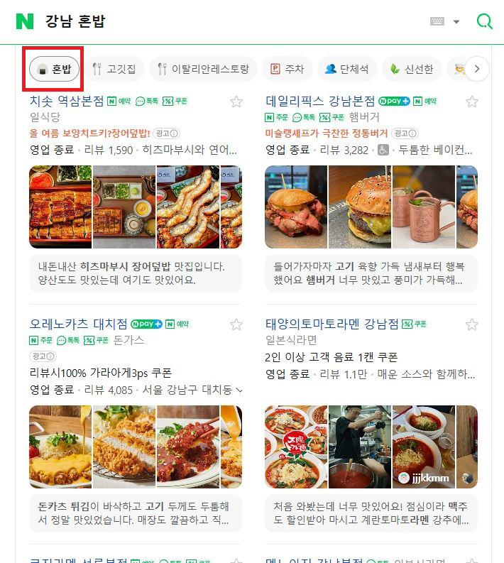 강남 혼밥을 검색하면 혼밥이라는 필터가 나오고