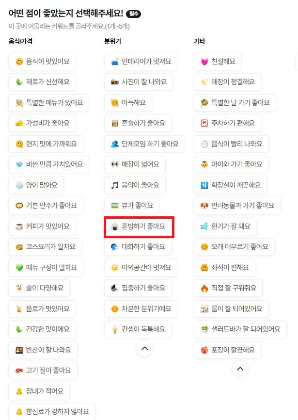 소비자가 선택하는 ‘선택 키워드’ 영역에 ‘혼밥하기 좋아요’라는 항목과 동일한 이모티콘이 있습니다.