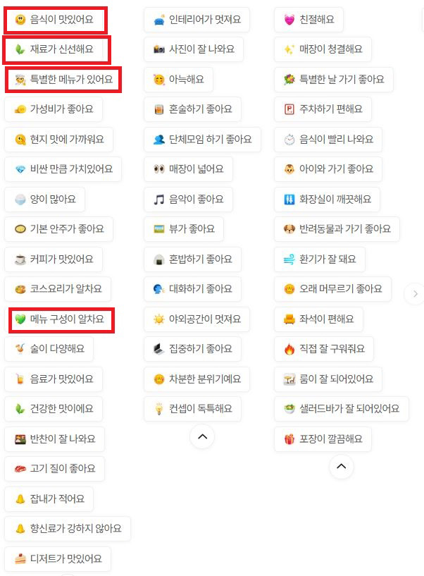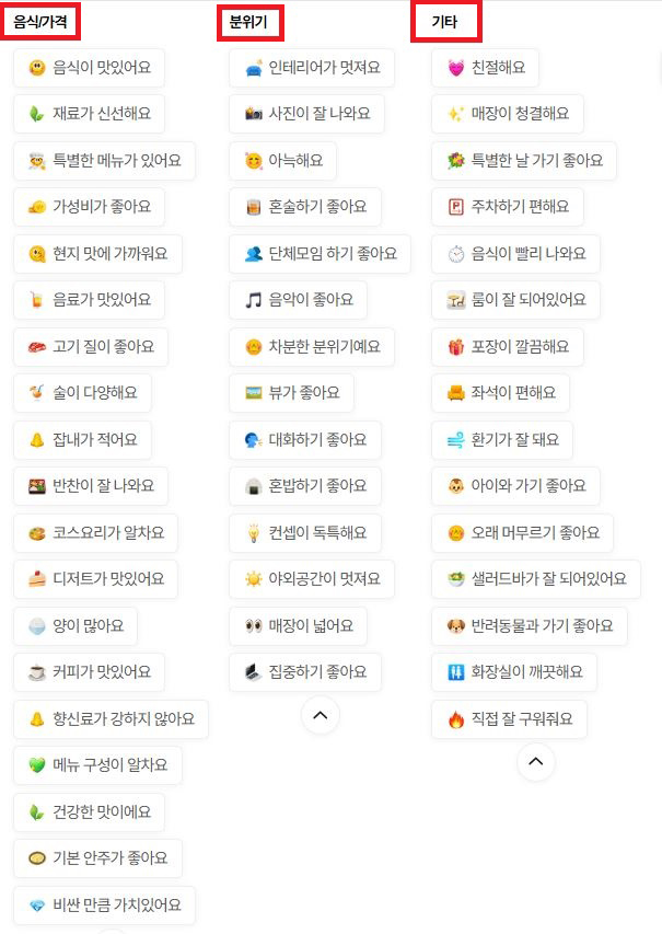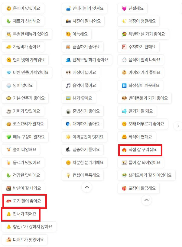 고기집이라는 키워드를 띄우고 싶다면 ‘고기 질이 좋아요’, ‘잡내가 적어요’, ‘직접 잘 구워줘요’ 같은 고기집에 특화된 항목을 선택하게 해야 되죠.