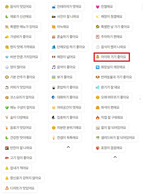 그렇다면 아이와 같이 오면 좋은, 매장 내 놀이터가 있는 곳이라면요? 맞습니다. 고민할 것도 없죠. ‘아이와 가기 좋아요’ 항목이 무조건 포함되게 해야 합니다.