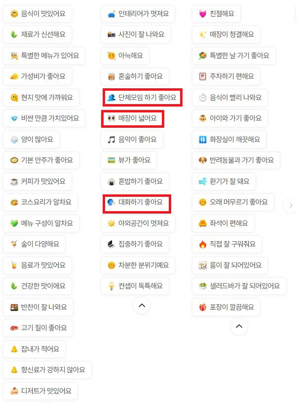 그렇다면 내가 회식 장소로 밀고 싶다면요? ‘단체모임 하기 좋아요’, ‘매장이 넓어요’, ‘대화하기 좋아요’와 같은 항목을 클릭하게 만들어서 선택 리뷰 영역 지수를 높여야 합니다.