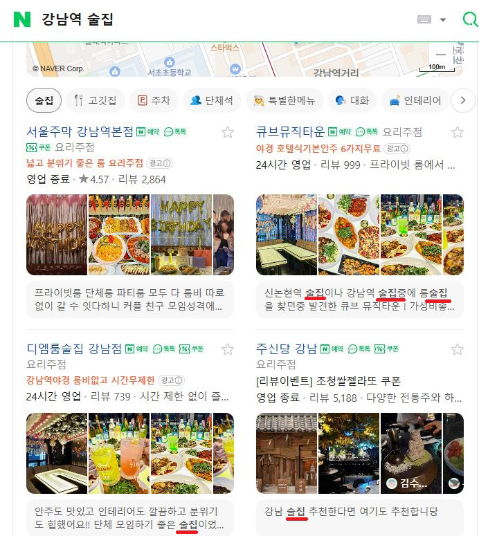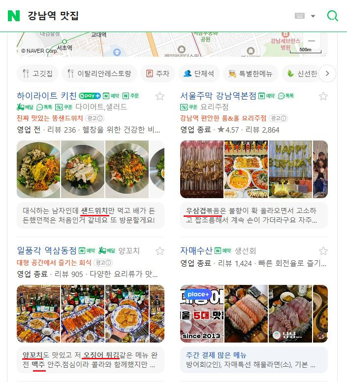 전부 직접적인 술집 키워드가 삽입되어 있습니다. 그렇다면 ‘강남역 술집’이라는 키워드를 노리고 있다면 리뷰에 메뉴명을 작성하게 유도해야 될까요? 아니면 술집 키워드를 작성하게 유도해야 될까요?