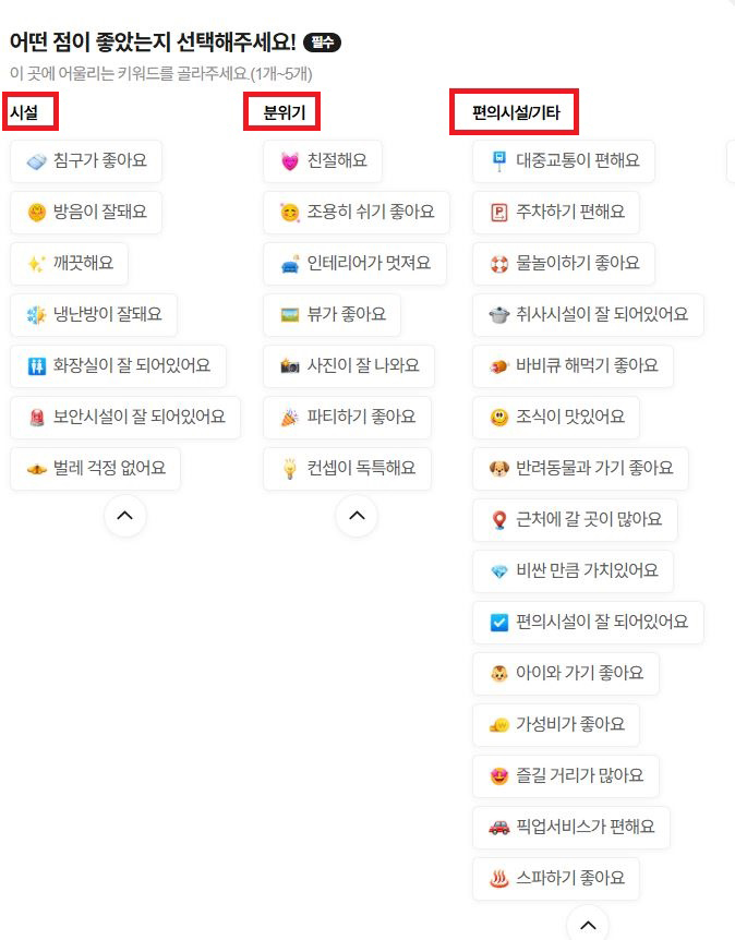 숙박업이라면 시설, 분위기, 편의시설/기타가 뜨며