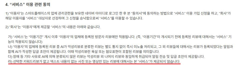 ‘선택한 키워드 리뷰가 없고 텍스트 내용이 없는 사진 또는 영상만 있는 리뷰에 대해서는 본 ‘서비스’가 제공되지 않습니다.