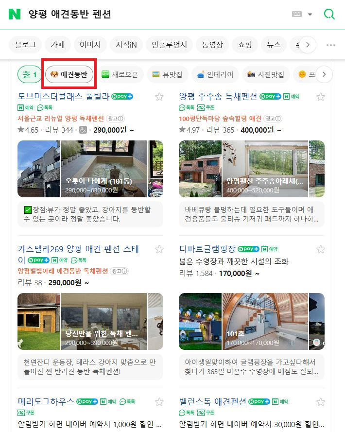 양평 애견동반 펜션을 검색한 결과입니다. 어? 검색 결과 상단 필터에 뭐가 있죠? ‘애견동반’이라는 항목이 있습니다. 그런데 어디서 많이 본 이모티콘이 있지 않나요?