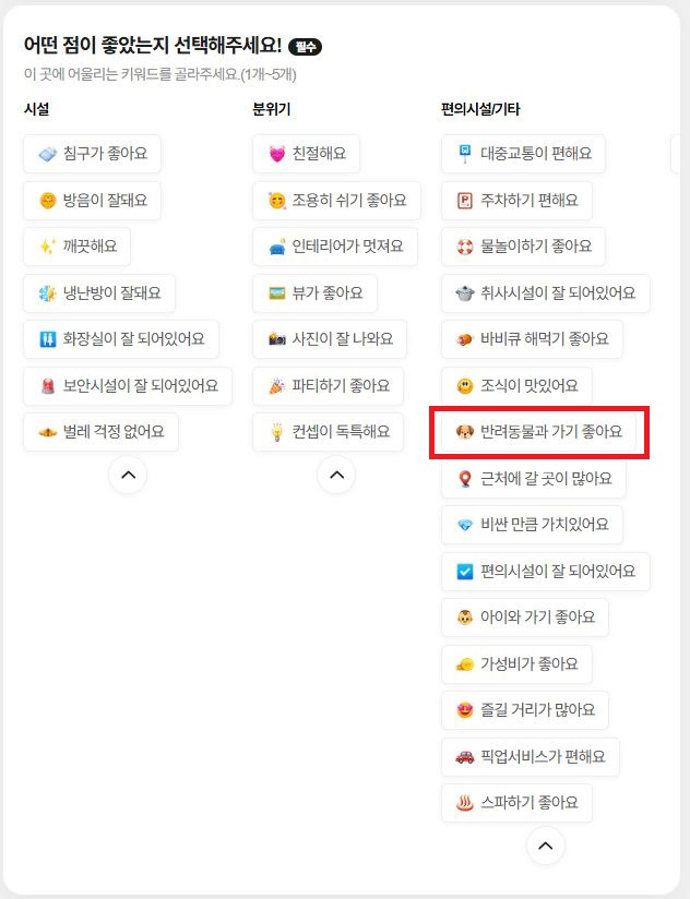 펜션 ‘선택 키워드’ 중 ‘반려동물과 가기 좋아요’ 항목의 이모티콘과 완전히 똑같습니다. 하나 더 볼까요?