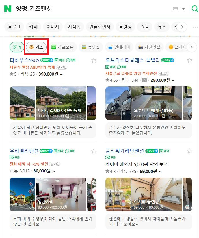 양평 키즈 펜션을 검색하면요? ‘키즈’라는 항목이 보이네요? 그런데 신기하게도