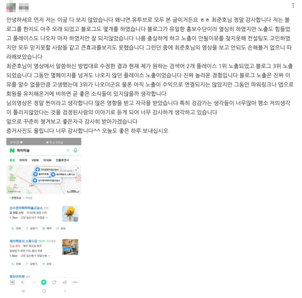 그런데 결과가 어떤가요? 컨설팅 받고 그 자리에서 순위 오르는 분들, 시간이 지나면서 자연스럽게 1등 찍었다는 분들이 쏟아지고 있습니다. 왜 그럴까요? 저는 가짜 트래픽이 아니라 그 업체에 맞는 ‘자연 트래픽’ 만드는 법을 알려드리고 있거든요. 이걸 아셔야 합니다.